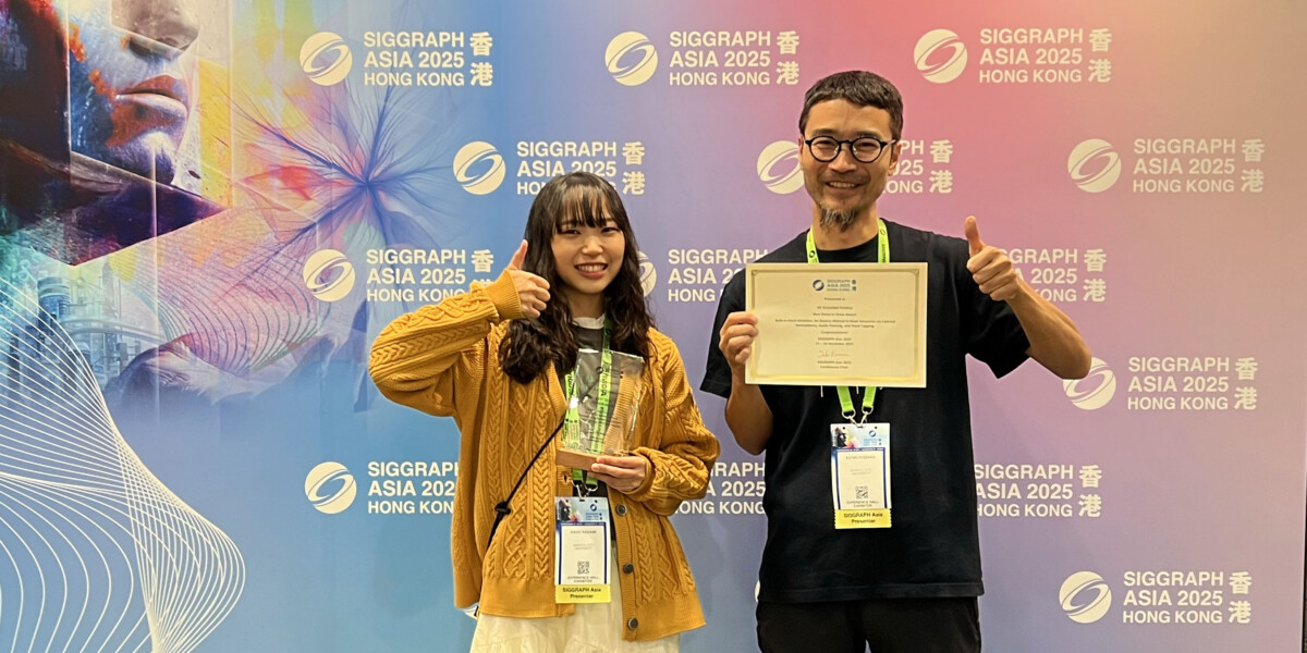 SIGGRAPH Asia 2025(香港)で、大学院2年・加賀美果歩の修士研究から2つの頭内錯覚デモの発表(XR部門)を行いました。XRは135件の投稿のうち、採択数はわずか26件(採択率19.2%)という超難関。そのうち2件の第一著者が加賀美さんという、快挙。そして、3日間の熱気あふれる展示を経て、なな … 続きを読む 2025.12|SIGGRAPH Asia 2025(香港)でXR部門の最高賞を受賞!